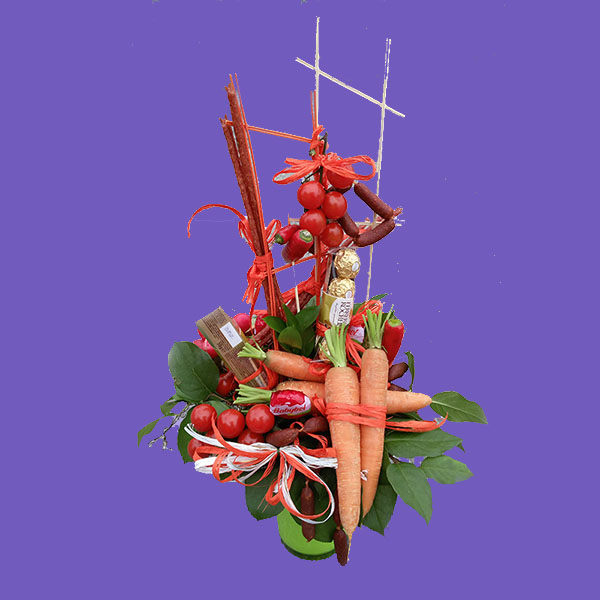 Klobásová kytice obsahuje pečlivě vybrané miniklobásky, šťavnatá cherry rajčátka, pikantní feferonky, čerstvé mrkve, oblíbený sýr Babybel, luxusní čokolády Ferrero Rocher a dekorativní zeleň. Originální jedlá kytice je ideálním dárkem pro milovníky masa, sýrů a netradičních gurmánských kombinací.