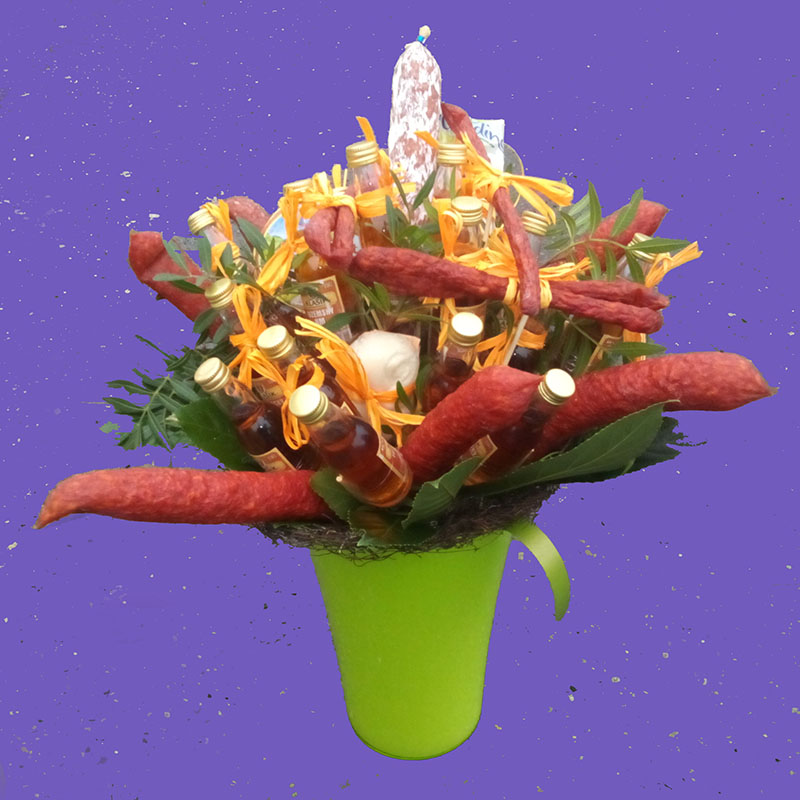 Klobásová kytice s delikátními uzeninami - fuet, čabajky, miniviržinky a lahvičkami rumu s dekorativní zelení.